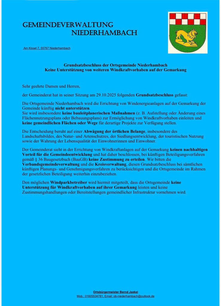 Grundsatzbeschluss des Ortsgemeinderats Niederhambach zu WindkraftvorhabenBy Bernd Jaekel5. November 20255. November 2025Allgemein